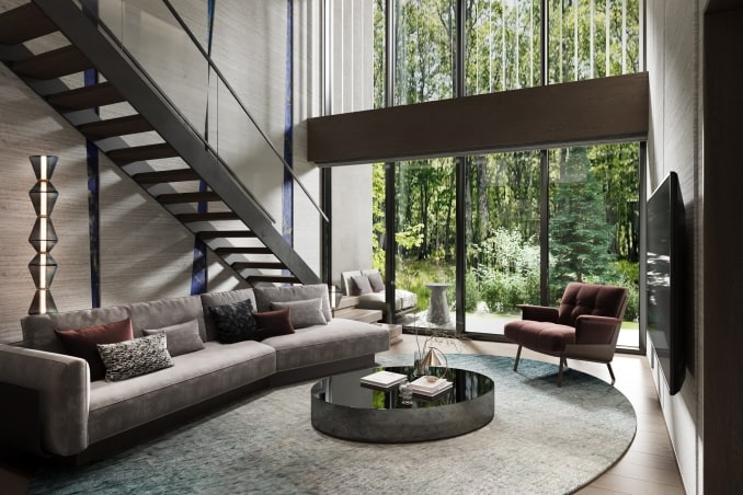 森の緑が一層引き立つよう、ダークな木調で落ち着いた高級感あるインテリア、大開口の窓、二層吹き抜けの空間が、別世界のレジデンスを創出します。