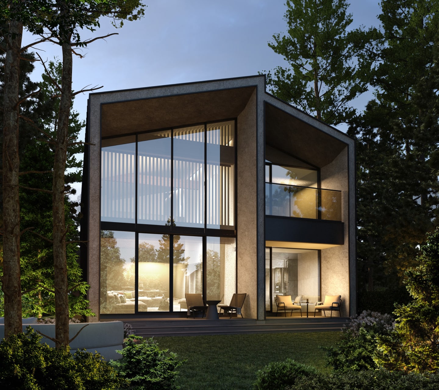 深い青をアクセントにしたスタイリッシュで静謐なインテリア。 森の景色が広がる窓は自然の美しさと生命力を存分に取り込み、その恵みと心地よさを体感できます。
